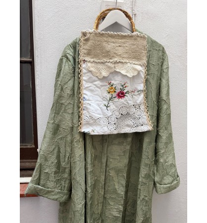 Bolso artesanal vintage de tamaño medio con forma rectangular donde el tejido de lino y algodón. Tonos crudos y beig con bordado floral y encaje blanco.